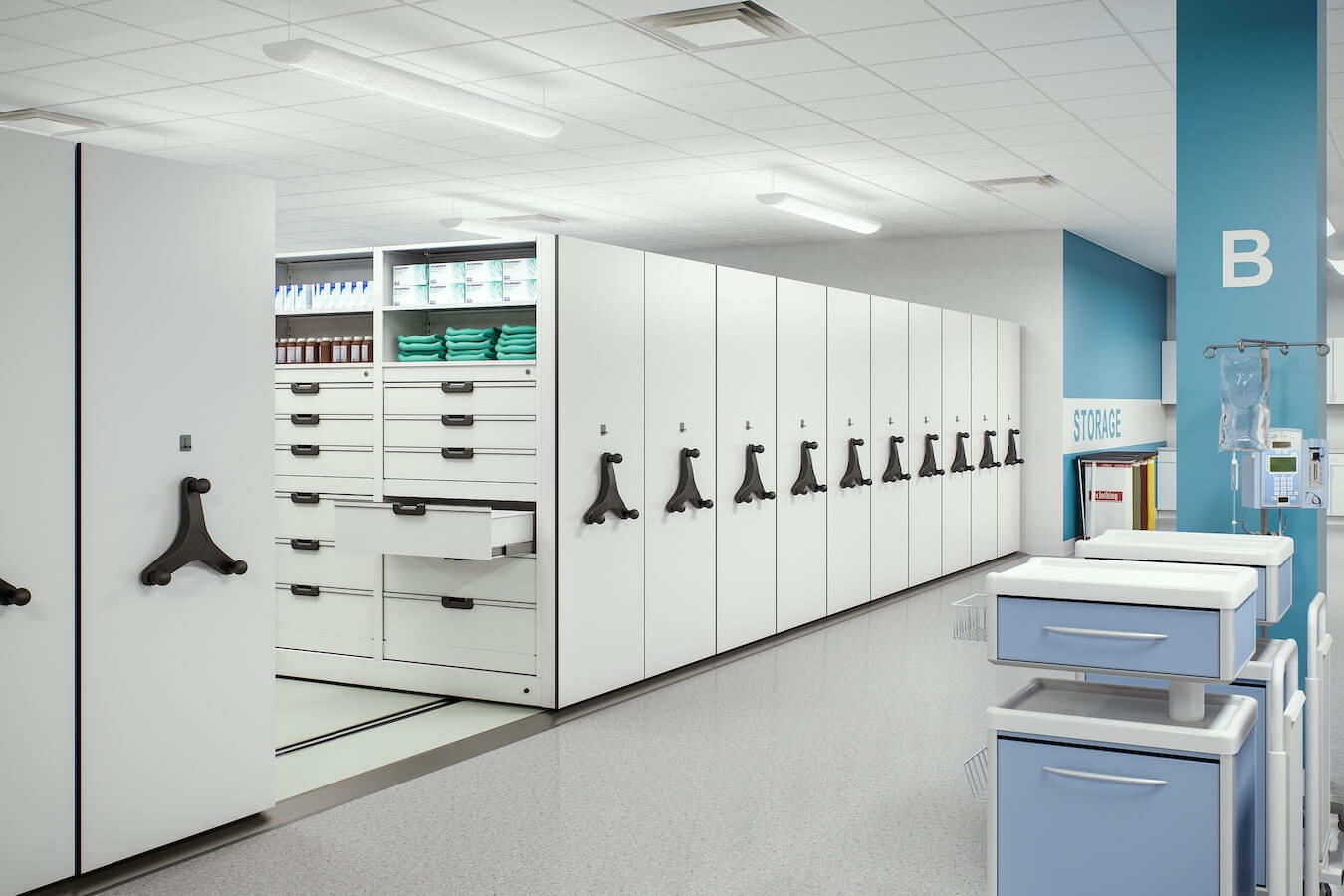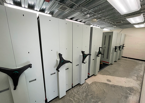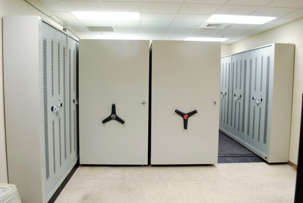 Removing permanent aisles allows available floor space to be used more efficiently, increasing overall storage capacity within the existing footprint. Shelving is compacted into a high-density layout that supports greater volume without limiting access to stored items. This approach helps organizations maximize storage while maintaining efficient use of space.