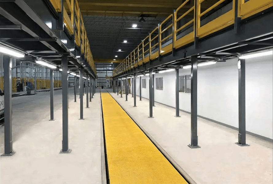 Built using steel-framed construction, office and observation mezzanines integrate seamlessly into active industrial environments while supporting administrative, supervisory, and quality control functions. The design emphasizes elevated sightlines across operations while limiting exposure to noise and floor-level activity. Enclosure options include permanent wall systems or wire partitions, allowing each installation to be tailored for privacy, acoustics, and security requirements. All systems are designed and manufactured in-house to align with facility constraints, operational flow, and long-term planning.