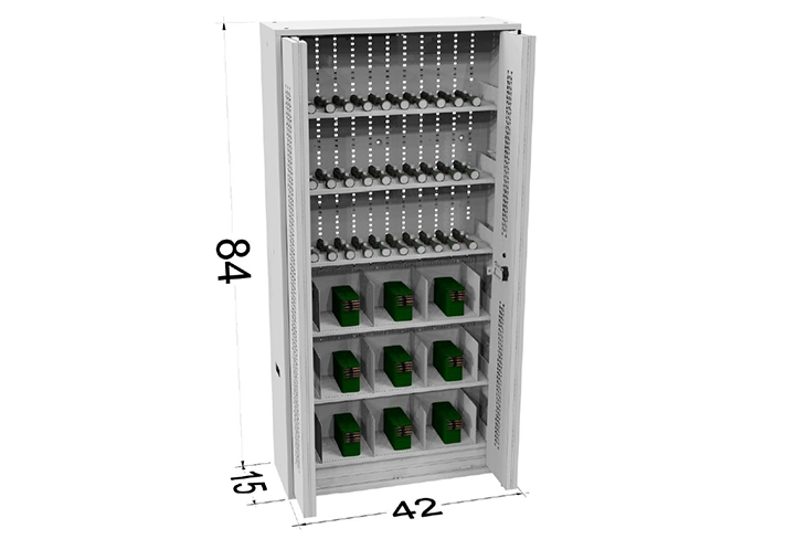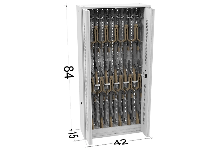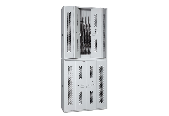 NSN crew‑served weapon cabinets are configured to securely store large-format weapons and their components within a single, organized enclosure. Universal weapon holders and barrel saddles, along with steel pegs and adjustable shelving, provide structured storage for barrels, tripods, firing mechanisms, and base plates. Cabinet layouts are designed around weapon weight, size, and access needs to maintain order, control, and safe handling.