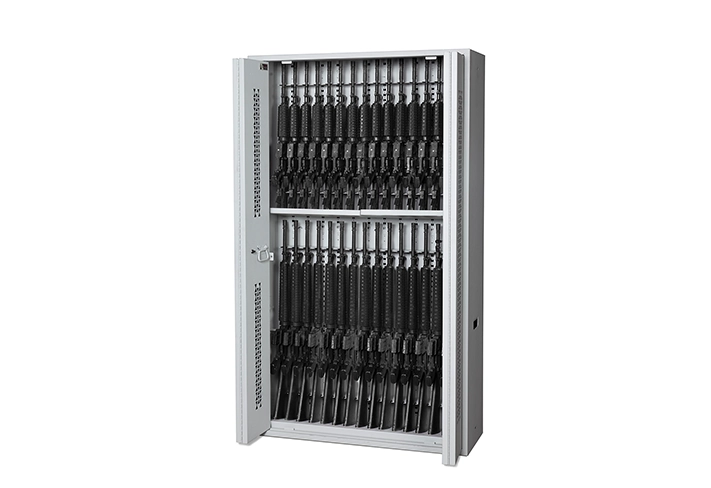 Machine guns require specialized storage engineered to support higher weight and size variability, including heavy barrels, mounting hardware, and linked ammunition. Reinforced steel bases angle weapons safely away from doors, while extra-wide barrel saddles provide added stability. This design allows weapons to be stored individually, in groups, or mixed with other firearms, depending on inventory and layout needs. Fully welded cabinets provide a secure, compliant foundation and function as stand‑alone units or with high-density mobile carriage systems.